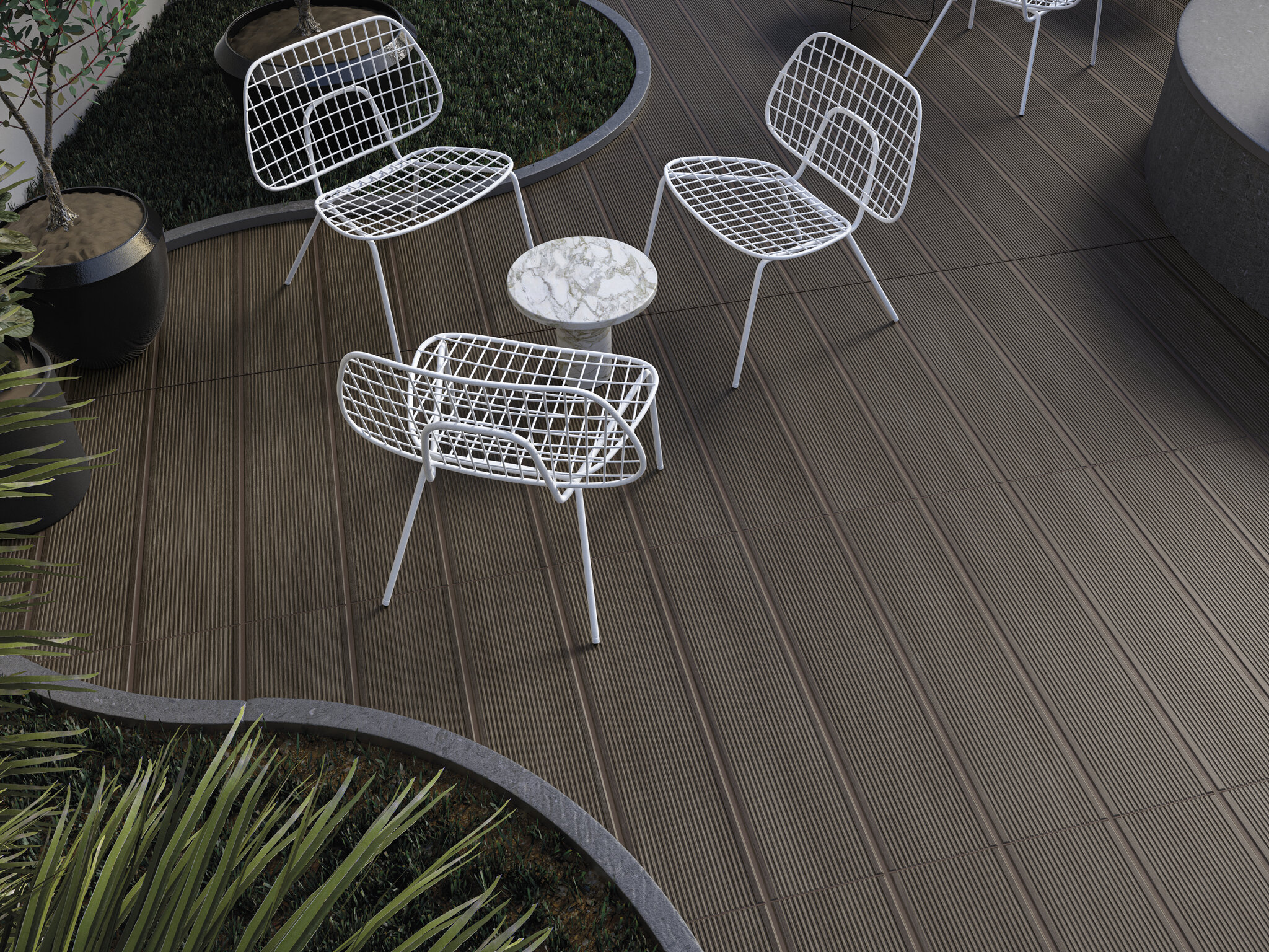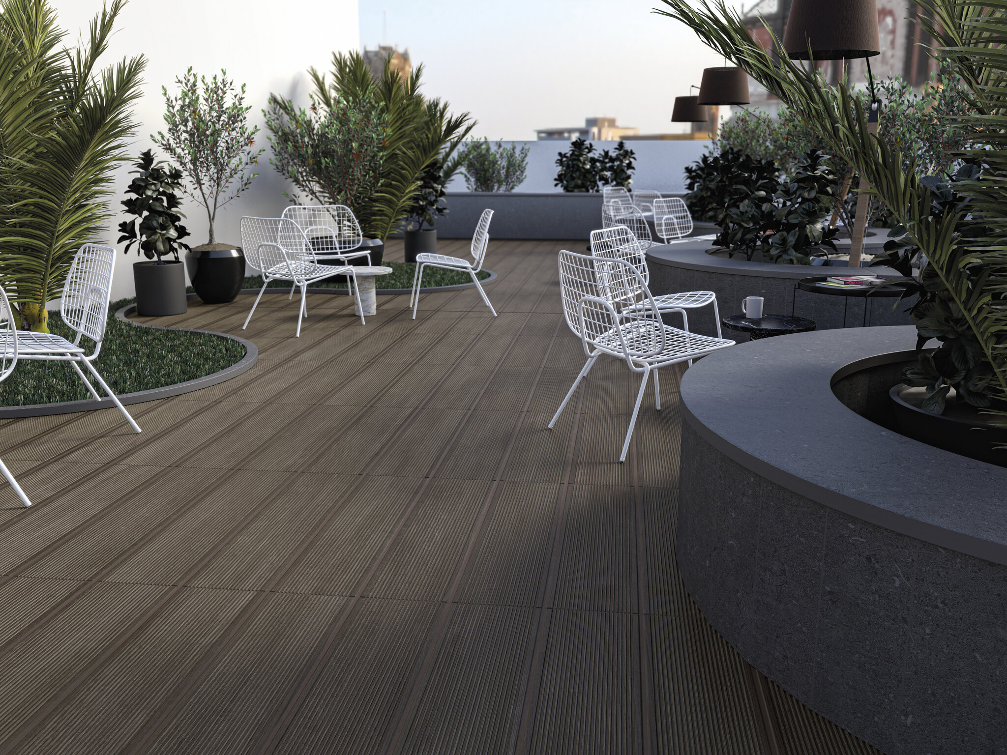 Η σειρά πλακιδίων δαπέδου Deck εκμεταλλεύεται την αισθητική του ξύλου και τα τεχνικά πλεονεκτήματα της πορσελάνης.