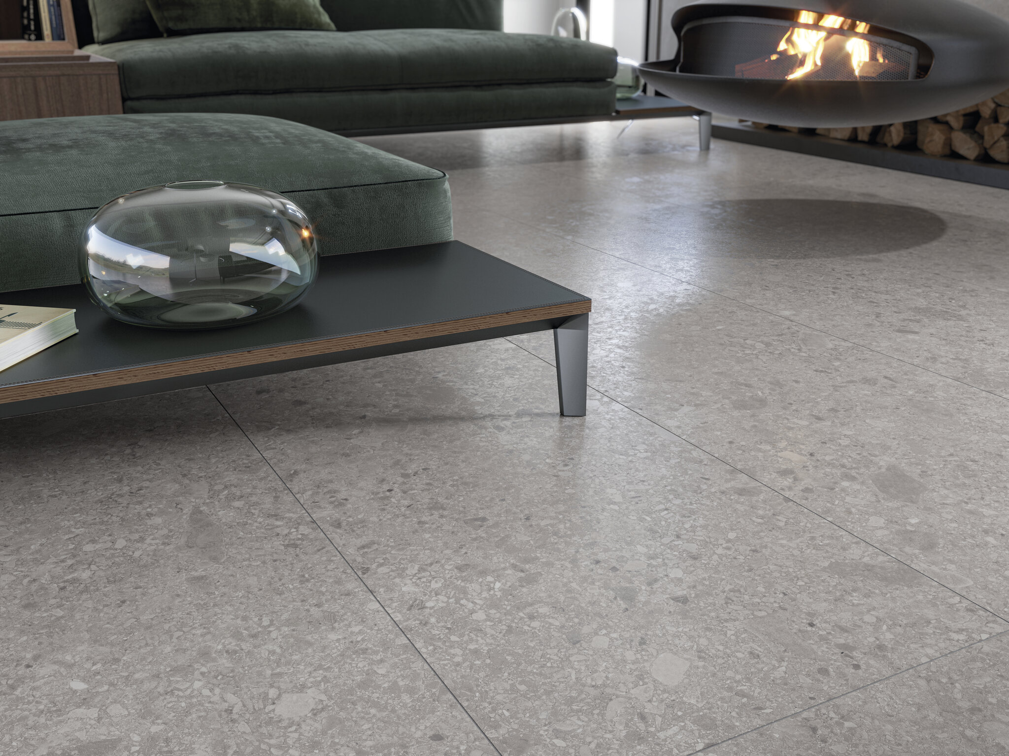 Ο σχεδιασμός αυτής της συλλογής πλακιδίων πορσελάνης παίζει με διάφορες φυσικές πέτρες διαφορετικών μεγεθών και έντασης χρώματος που είναι ένθετες σε ουδέτερο φόντο.