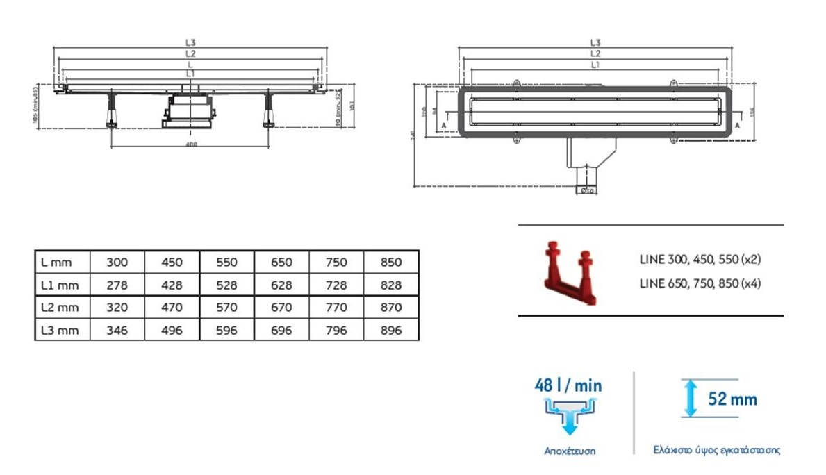 Σιφόνι δαπέδου ευθύγραμμο, χαμηλού προφίλ που καταλαμβάνει τον ελάχιστα δυνατό χώρο κάτω από το δάπεδο.