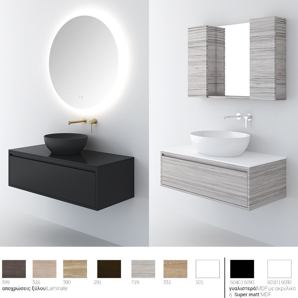 Διατίθεται σε έξι διαφορετικές αποχρώσεις ξύλου και σε λευκό χρώμα – Laminate καθώς και σε μαύρο και λευκό γυαλιστερό ή ματ mdf. Κατόπιν επιλογής, μπορεί να συνοδευτεί με γραμμικό φωτιστικό μπάνιου Led.