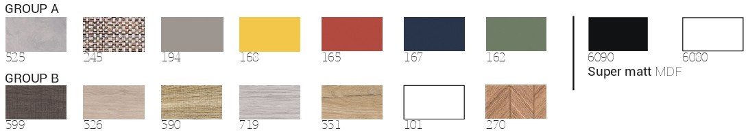 Διατίθεται σε επτά διαφορετικές αποχρώσεις, καθώς και σε μαύρο και λευκό ματ mdf.