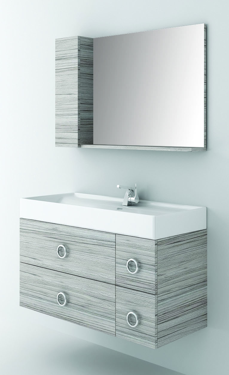 Σετ μπάνιου 2 τεμαχίων, αποτελούμενο από πάγκο και νιπτήρα. με δυνατότητα επιλογής 6 χρωμάτων σε διαστάσεις 100×45 εκατοστά. Αποτελείται από κρεμαστή βάση με 4 συρτάρια, νιπτήρα από πορσελάνη, καθρέπτη με κρυφό ντουλάπι, χρωμέ χερούλια και μηχανισμούς soft close σε όλα τα μέρη. Ο πάγκος διαθέτει αποθηκευτικό χώρο και ο νιπτήρας που περιλαμβάνεται εφάπτεται πάνω στον πάγκο. Τοποθετείται κρεμαστά στον τοίχο.
