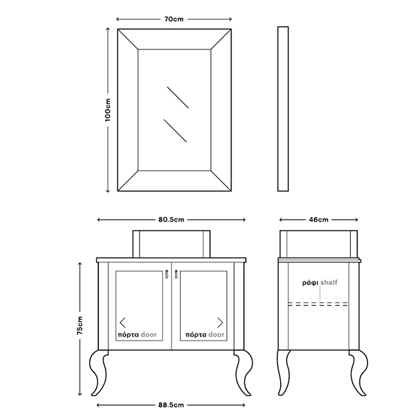 Περιλαμβάνει βάση, νιπτήρα, πάγκο και καθρέπτη.