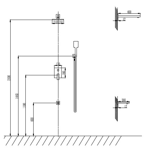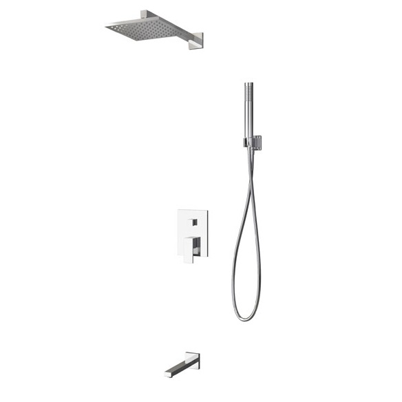 Μπαταρία ντουζιέρας εντοιχισμού 5 δρόμων με Επιτοίχιο μπράτσο, Κεφαλή ντουζιέρας 21x21cm,Τηλέφωνο χειρός με βάση στήριξης, Σπιράλ PVC 150cm και Επιτοίχιο στόμιο. Διατίθεται σε Χρώμιο φινίρισμα και έχει Ολικό ύψος 2.100cm.