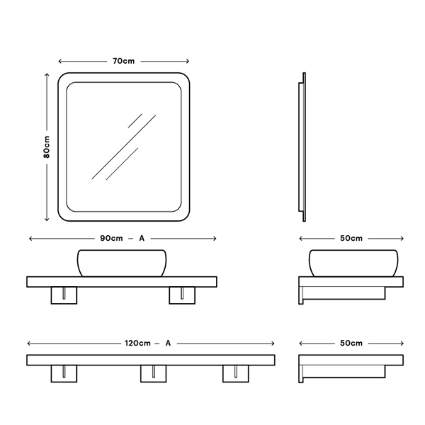 Περιλαμβάνει πάγκο, μεταλλική βάση, σιφώνι νιπτήρος, νιπτήρα, κάτω ράφι και καθρέπτη.