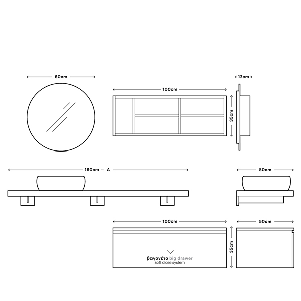 Περιλαμβάνει πάγκο, μεταλλική βάση, σιφώνι νιπτήρος, νιπτήρα, ερμάριο κάτω πάγκου, άνω ράφι και καθρέπτη.